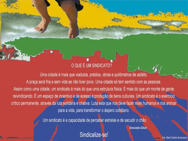 Assim como uma cidade, um sindicato é mais do que uma estrutura física. É mais do que um monte de gente reivindicando. É um espaço de incentivo e de acesso à produção de bens culturais. Um sindicato é o exercício crítico permanente, através da luta solidária e criativa. Luta esta que nos deve fazer mais humanos e nos animar para a vida, para transformar o áspero cotidiano.
